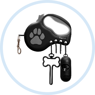 StitchLeash's Coops Retractable Leash's starter kit includes hooks, a dirty poop bag holder and a waste dispenser. It features innovative openings for accessories, a secure lock and release, retractable nylon tape with a reflective strip and an ergonomic anti-slip handle.