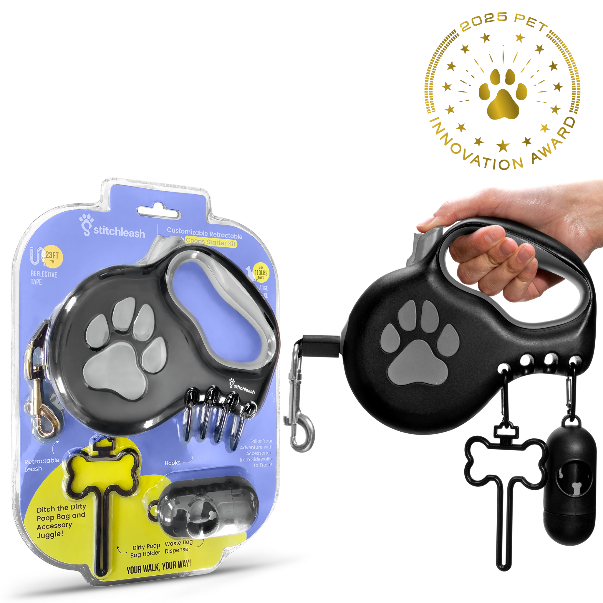 "StitchLeash’s Coops Retractable Leash’s starter kit includes hooks, a dirty poop bag holder, and a waste dispenser. It features innovative openings for accessories, a secure lock and release, retractable nylon tape with a reflective strip and an ergonomic anti-slip handle."